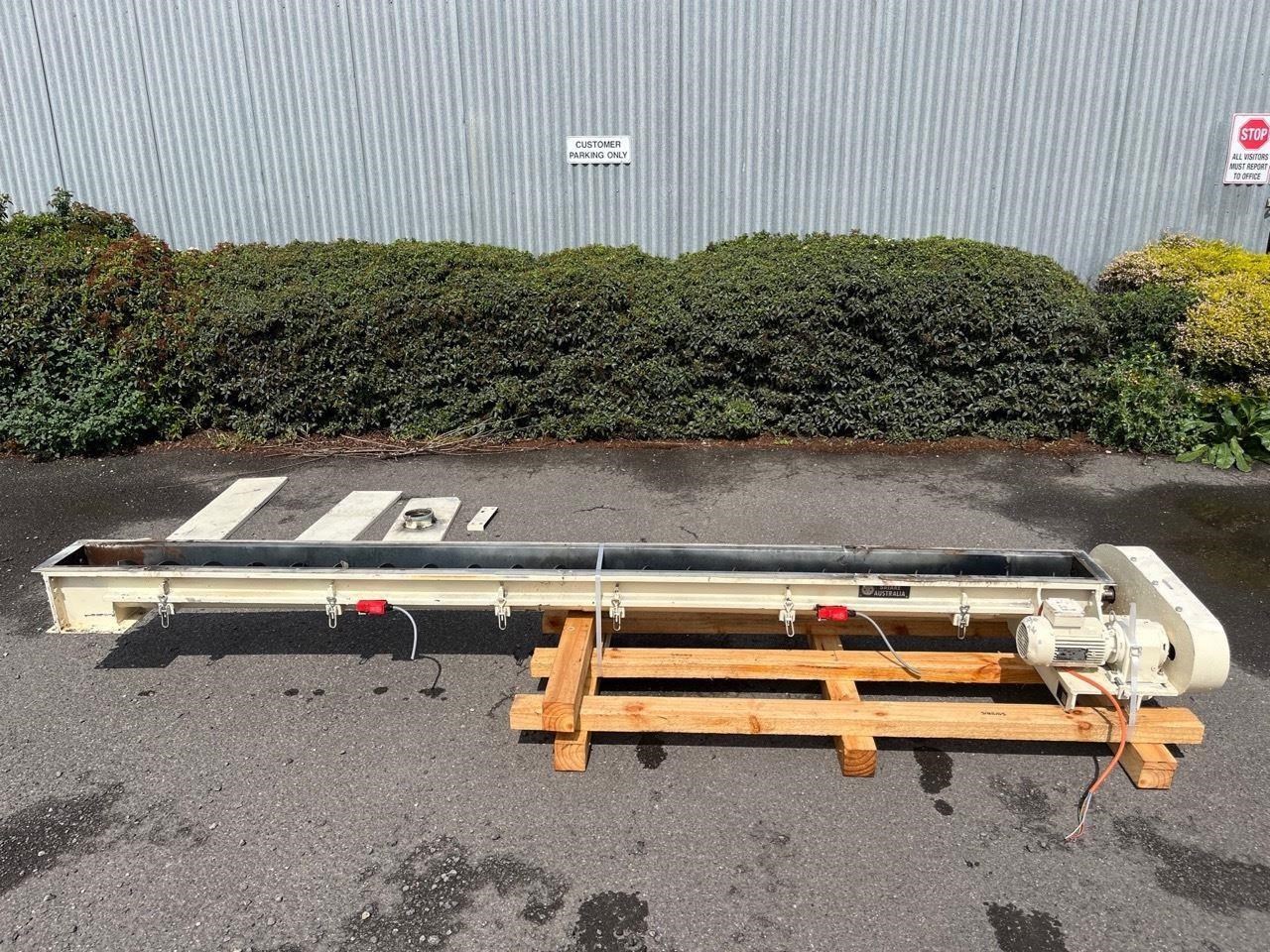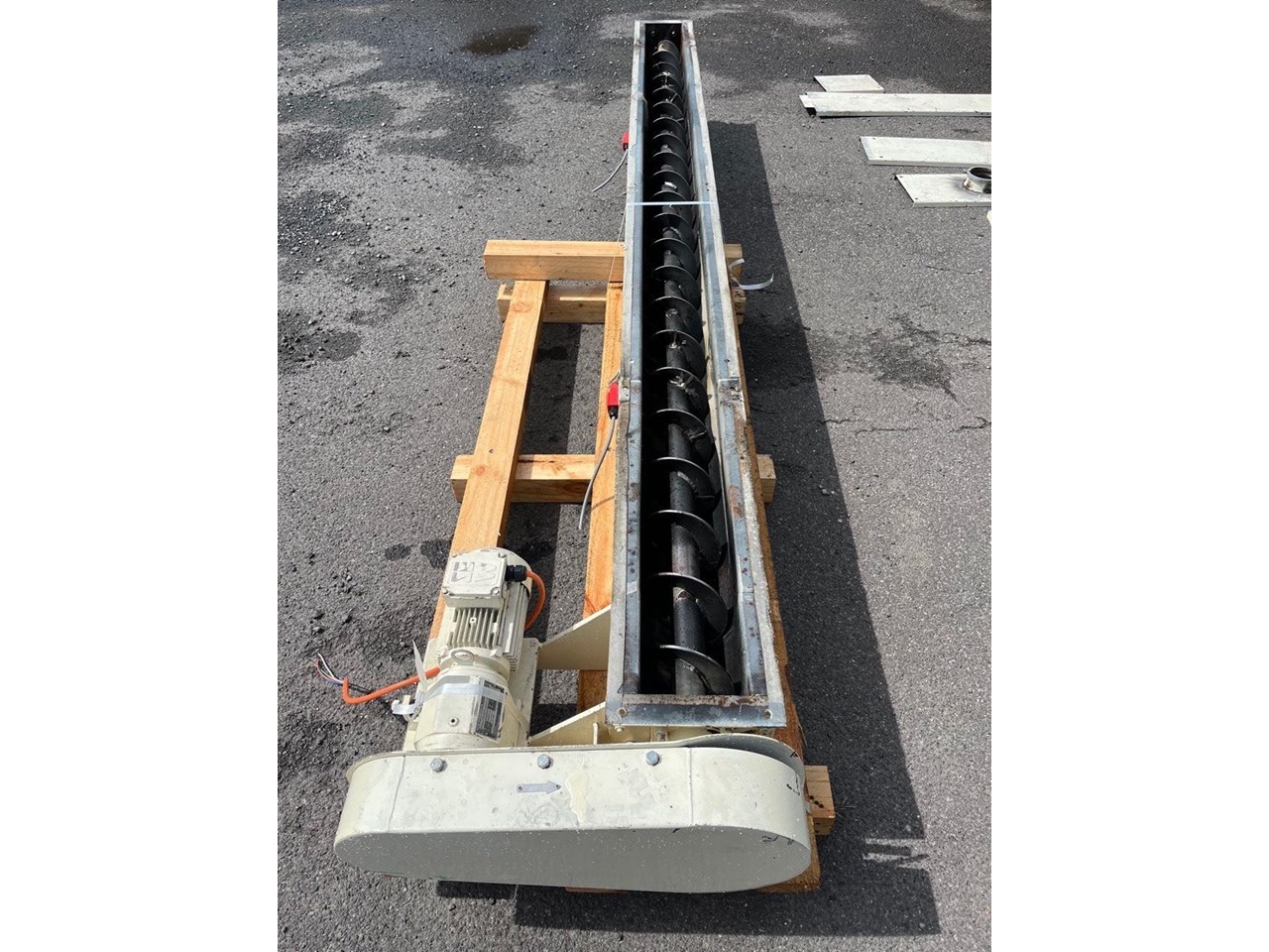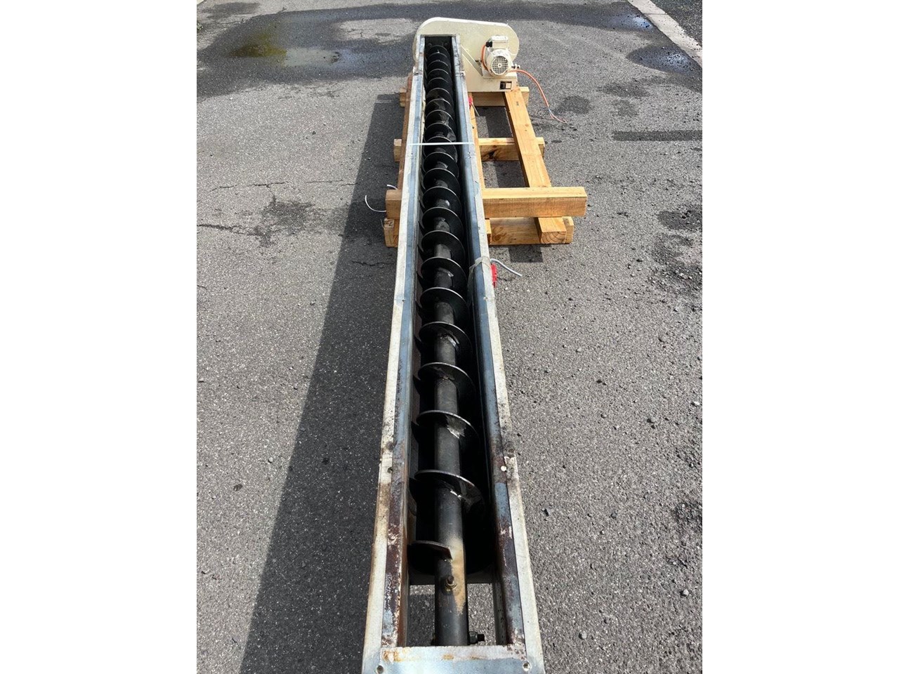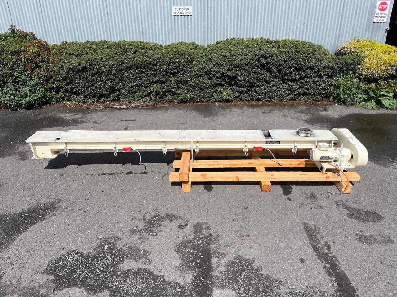 Mild steel screw conveyor 0.75kw, 400V, SEW geared motor. Gearbox output 87rpm. Auger 66rpm. Auger length 3400mm Overall length 3700mm Diameter 150mm Flight pitch 140mm Flight thickness 5mm Inlet diameter 125mm Outlet 170mm X 170mm Runs Well