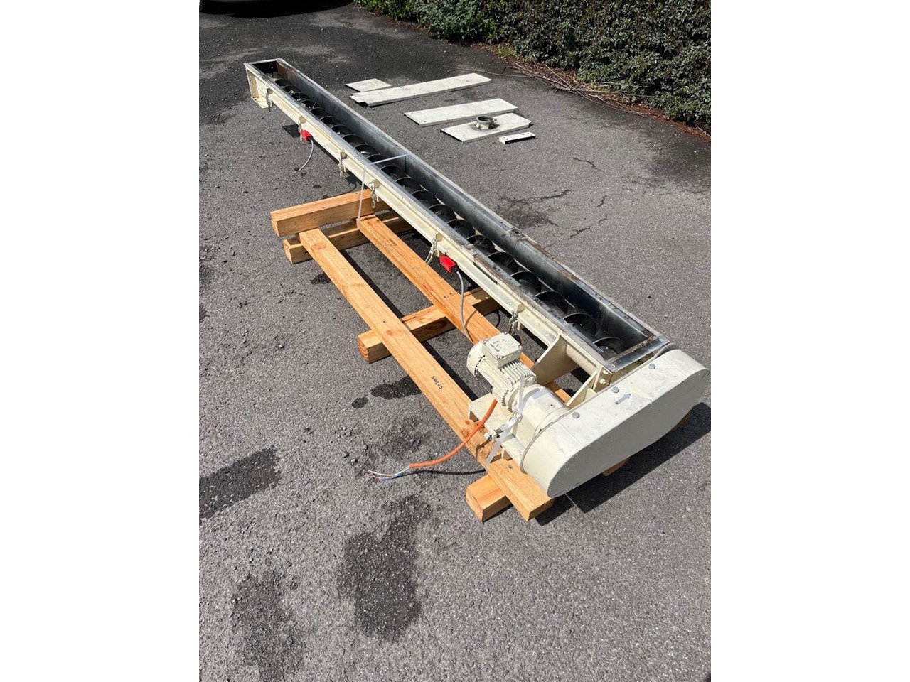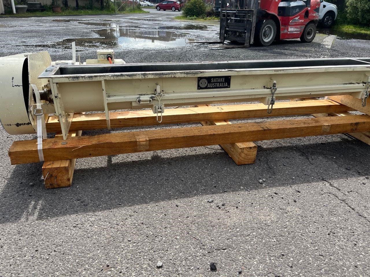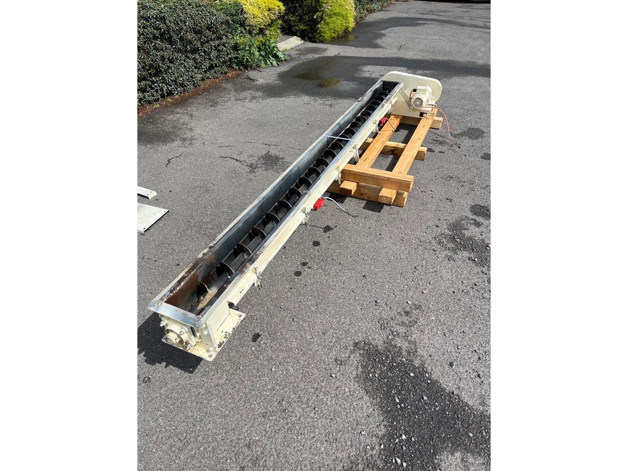 Mild steel screw conveyor 0.75kw, 400V, SEW geared motor. Gearbox output 87rpm. Auger 66rpm. Auger length 3400mm Overall length 3700mm Diameter 150mm Flight pitch 140mm Flight thickness 5mm Inlet diameter 125mm Outlet 170mm X 170mm Runs Well