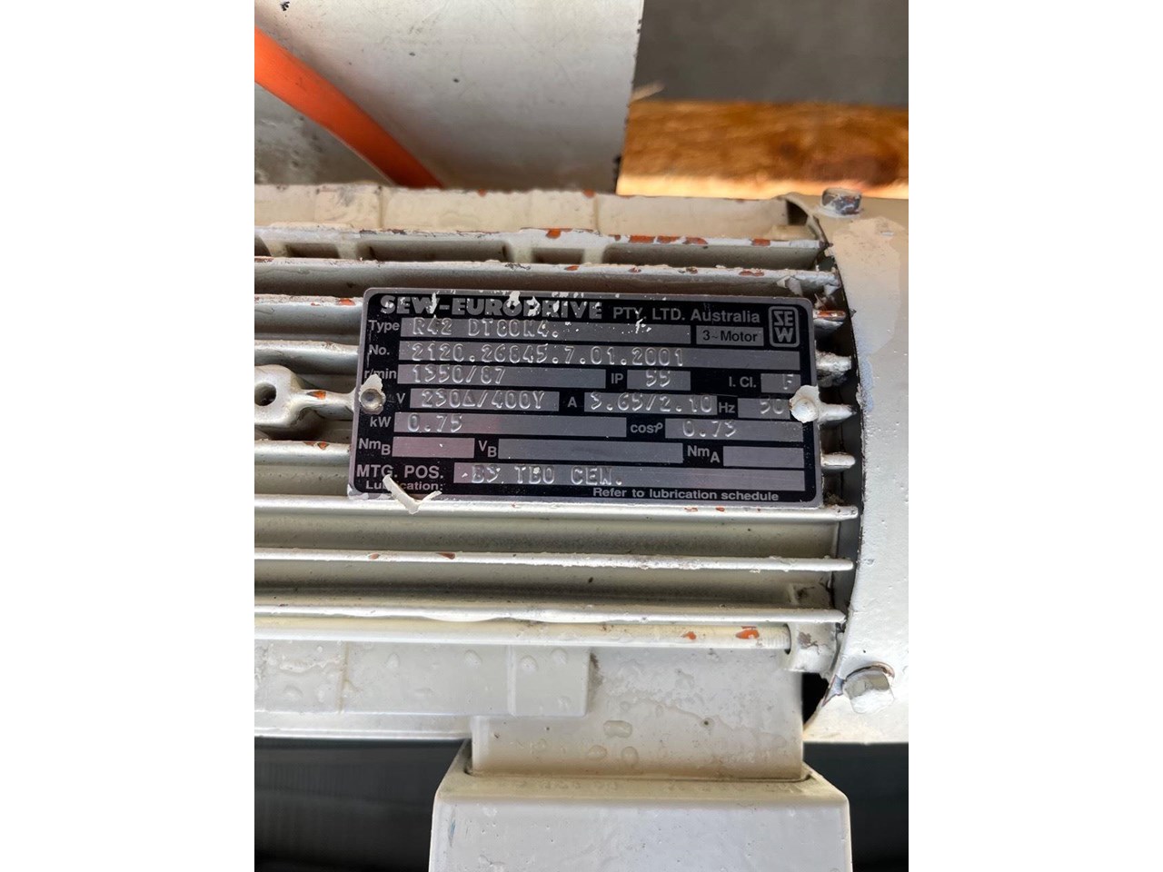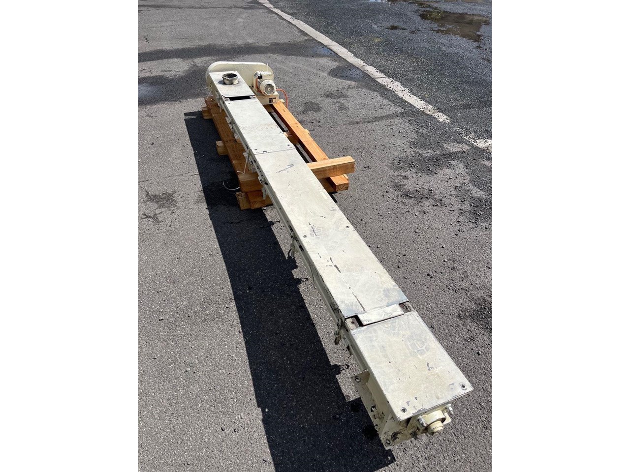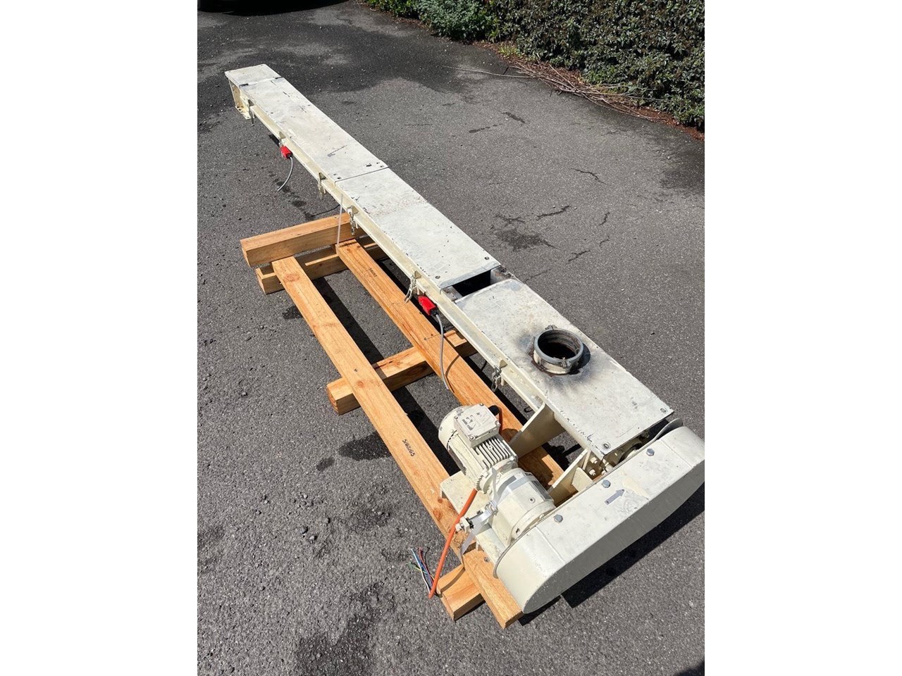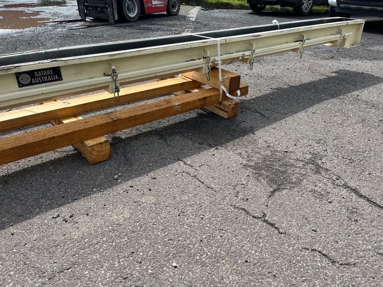 Mild steel screw conveyor 0.75kw, 400V, SEW geared motor. Gearbox output 87rpm. Auger 66rpm. Auger length 3400mm Overall length 3700mm Diameter 150mm Flight pitch 140mm Flight thickness 5mm Inlet diameter 125mm Outlet 170mm X 170mm Runs Well
