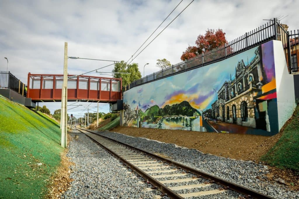 A new mural has been completed alongside the bridge as part of the volunteer-managed Rail Care program. The artwork, created by street artist Adam Poole-Mottishaw, depicts the Gawler township and local area past and present.